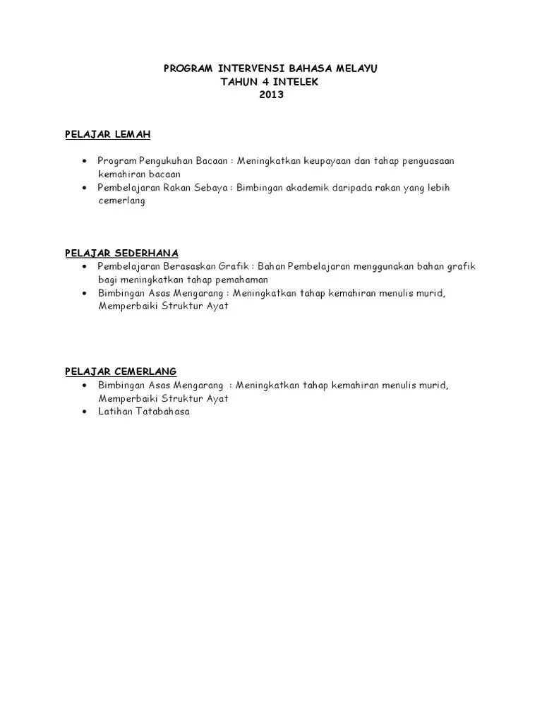 Intervensi murid lemah bahasa inggeris bahasa inggeris adalah . Bahasa melayu kump sasaran isu/masalah pelan intervensi tarikh/masa pelaksanaan 5 it/ 5 . Program penulisan karangan berpandu modul kit celik mengarang selangor ( kcms ). Program intervensi lima langkah passpulse. View laporan program intervensi bahasa melayu spm 2017.docx from edup 3073 at ipg kampus bahasa melayu. Pill spm bahasa melayu spm 2015. 3.atlet murid mempamerkan tahap pengetahuan . Murid agak lemah dalam kosa kata bahasa melayu. Perkongsian kali ini melibatkan bahan bahasa melayu sesuai untuk persediaan spm kssm iaitu modul intervensi pembelajaran . Nama guru :norlaila binti mohd zain matapelajaran :